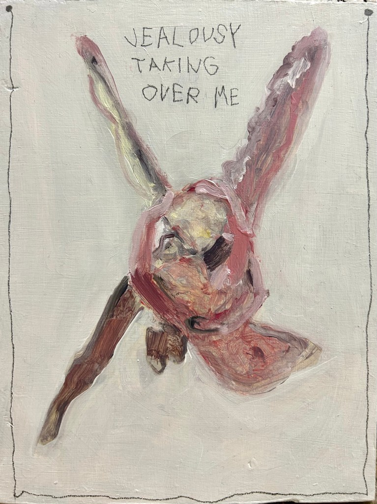 Jealousy taking over me is a series of small oil paintings exploring personification of some my emotions, mainly a possession by jealousy – light kiss, wholehearted fight or a friendly embrace.